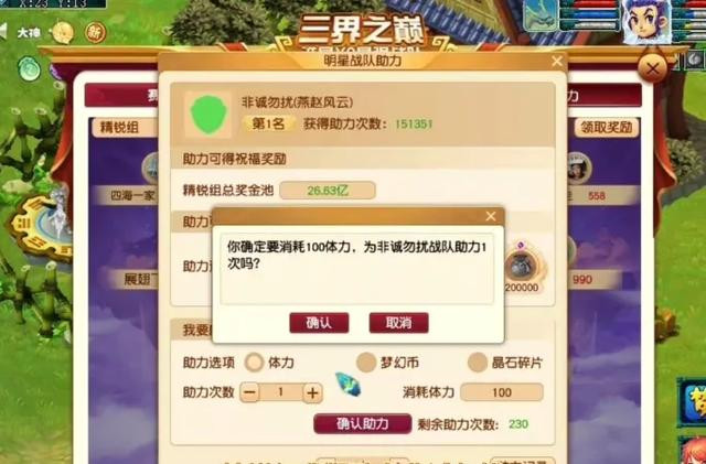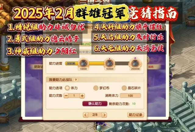 我们首先点击左上角X9三界之巅,然后开始助力各个比武组。精锐组我们助力非诚勿扰,勇武组我们助力德云皓子,神武组我们助力剑锋所指,天科组我们助力旗开得胜,天启组我们助力及时行乐,然后天元组我们助力天湾竞技。每次助力只需100体力,错过再等一整年,大家快去试试吧。