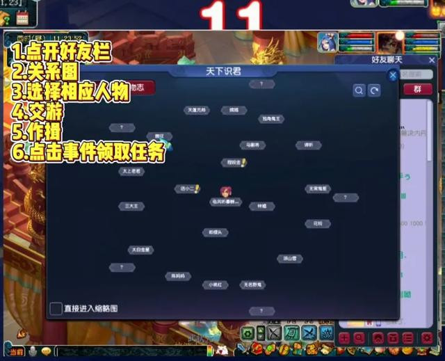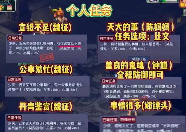 首先一次点开好友栏关系图选择人务,再点击交友,做一次公共任务,完成这五种心情不佳,来此小聚,物品丢失,来此挑衅,对我族不满。个人任务完成宣职不足,公事繁忙,公亲鉴赏,天大的事,善良的鬼魂,事情很多。特殊任务需好感度500,听魏征捞叨,三个回合击杀水花和海浪能获得双倍奖励,大家记住了吗?